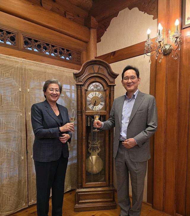 지난 18일 이재용 삼성전자 회장(우측)이 리사 수 AMD 최고경영자(CEO)와 서울 용산구 이태원동에 위치한 삼성그룹 영빈관 승지원에서 만나 기념사진을 촬영하고 있는 모습이다. [사진=삼성전자]