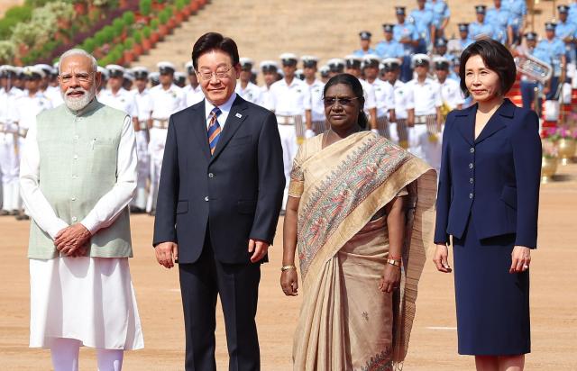 이재명 대통령과 김혜경 여사가 20일(현지시각) 인도 뉴델리 대통령궁에서 열린 국빈 방문 공식환영식에서 드로우파디 무르무 대통령, 나렌드라 모디 총리와 기념촬영하고 있다. 왼쪽부터 모디 총리, 이 대통령, 무르무 대통령, 김 여사.[사진=연합뉴스]
